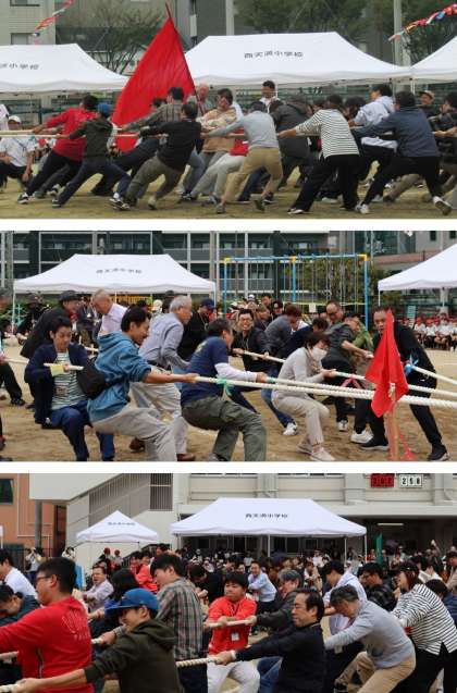 子どもたちの競技のあと、PTA・地域のみなさまによる「大綱引き」も2年ぶりに実施しました。大人が西天満チームと菅南チームに分かれて、力いっぱいに綱を引き合う姿を見て、児童席の子どもたちからも大歓声があがりました。