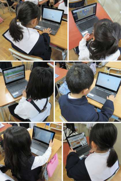 1年生の教室です。朝の時間に、タブレットを使って「心の天気」の入力をしています。使い始めてまだひと月あまりですが、もう上手に使いこなしています。さすがデジタル世代の子どもたちです!