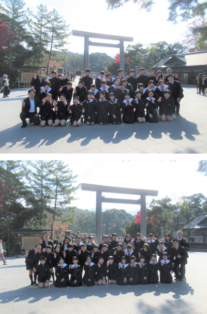 最初の目的地である「伊勢神宮」に到着しました。まずは、入口の鳥居のところで、クラスごとに記念写真を撮りました。予想していたほどの混雑はなく、ゆっくりと見学できそうです。