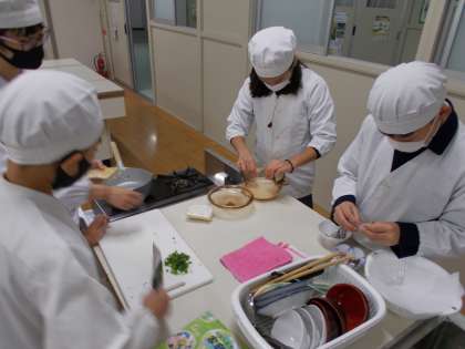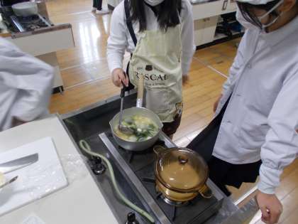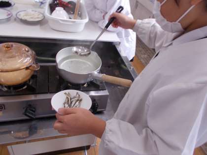 5年生が調理実習で「ご飯」と「みそ汁」を作りました。ご飯は耐熱ガラス鍋で炊いたので、どのようにご飯が炊けるのかを観察することができました。「米が膨らんできている!」「水が減って、泡でいっぱい!」と変わっていく様子がよくわかり、火加減に気を付けながら、おいしく炊きあげました。みそ汁の実は「だいこん」が必須。「うすあげ」か「とうふ」、「わかめ」か「ねぎ」を班で選びました。煮干しでとっただしの香りが、家庭科室いっぱいに広がりました。「家でもやってみたい!」という声もあがっていました。学んだことをぜひ家庭でも生かしてほしいと思います。