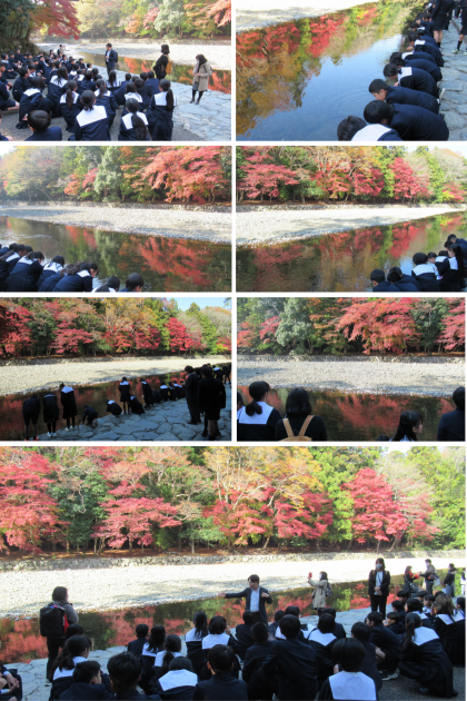 五十鈴川のほとりに出ました。川の水は驚くほど冷たくて、身の引き締まる思いがしました。また、見事な紅葉が、五十鈴川の水面に映え、まるで絵画の世界に入り込んだような心地になりました。