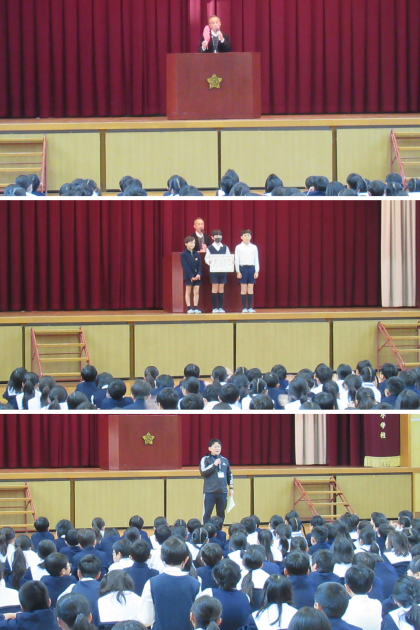 今週の全校朝会の様子です。校長先生からは、先週児童会の人たちが中心に行った「赤い羽根募金」についてのお話がありました。募金をする大切さや、赤い羽根以外の取組についても調べてみてほしいというお話がありました。また、バレーボール・ドルフィンズの表彰があり、頑張りを拍手で称えました。最後に、司会の先生からは、今月の生活目標「整理・整とんをしよう」について、「いらない物は捨てる」「使いやすいように並べる」を意識して行いましょう、というお話がありました。