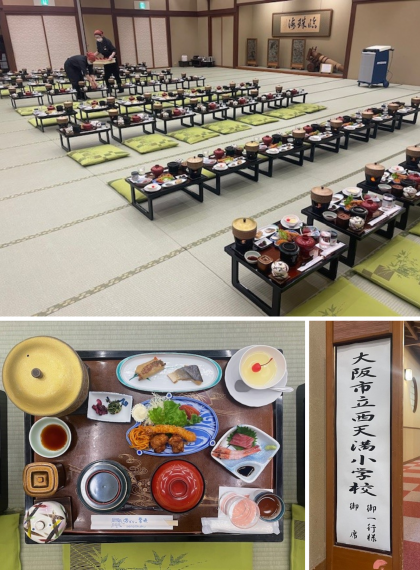 お風呂のあとは、いよいよ夕食の時間です。大広間には、すでに立派なお膳が整えられています。