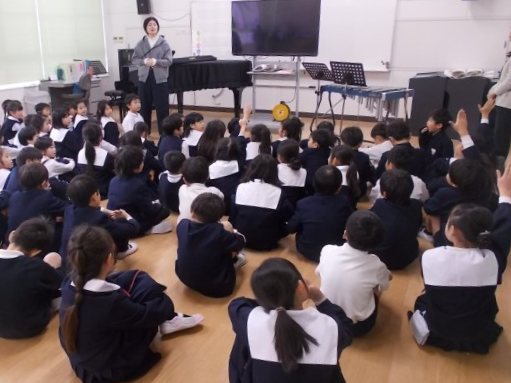 歌ってみたあと子どもたちからは、「1年生と2年生が一緒に歌うと声が大きくなった」「ちがう音(旋律)にひっぱられた」「合わせて歌うとおもしろかった」などの声があがりました。明日、旋律を重ねて歌うときのコツを6年生に聞いてみよう、と話をしました。