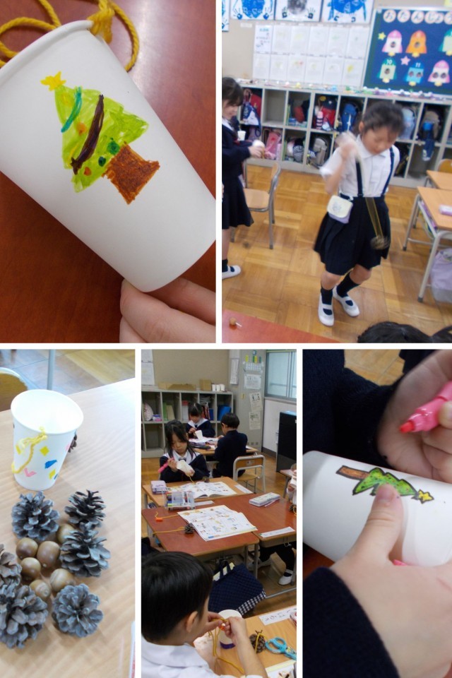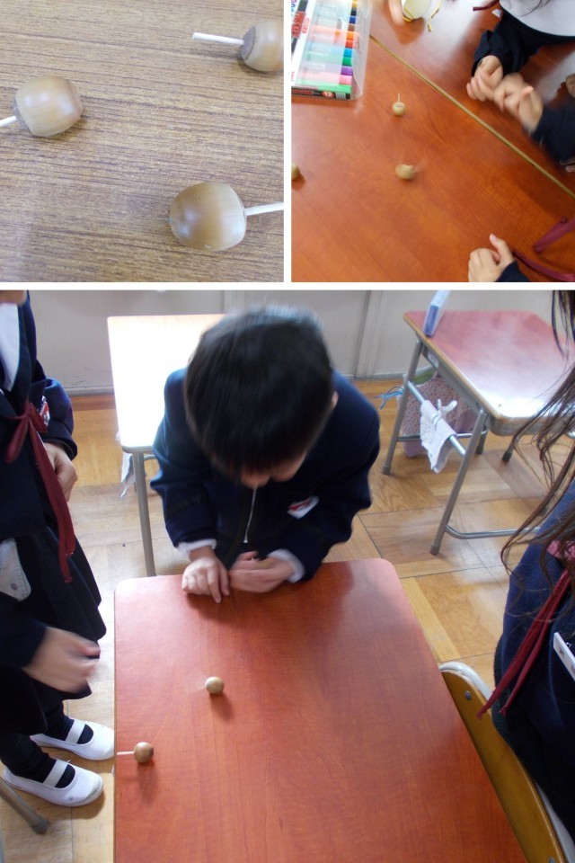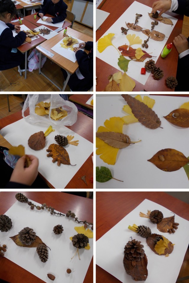 1年生の生活科の学習です。集めた落ち葉やどんぐり、まつぼっくりなど、秋の材料を使って、いろんな「あきあそび」をしました。落ち葉やどんぐりを使った見立て遊び、どんぐりごま、まつぼっくりけん玉・・・遅い秋を堪能しました。材料集めにご協力いただいた皆様、ありがとうございました。