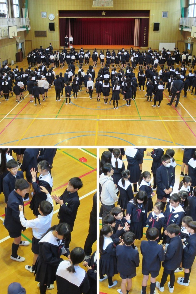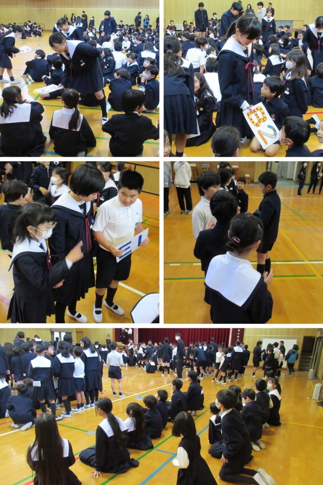 今回の児童集会は、「バースデーチェーン」をしました。口に出さずに自分の誕生日を班の人に伝えて、順番に並べたら成功です。みんな身振り手振りで数字を伝えようと頑張っていました。また、名前の五十音順での並び替えにも挑戦し、楽しく活動しました。