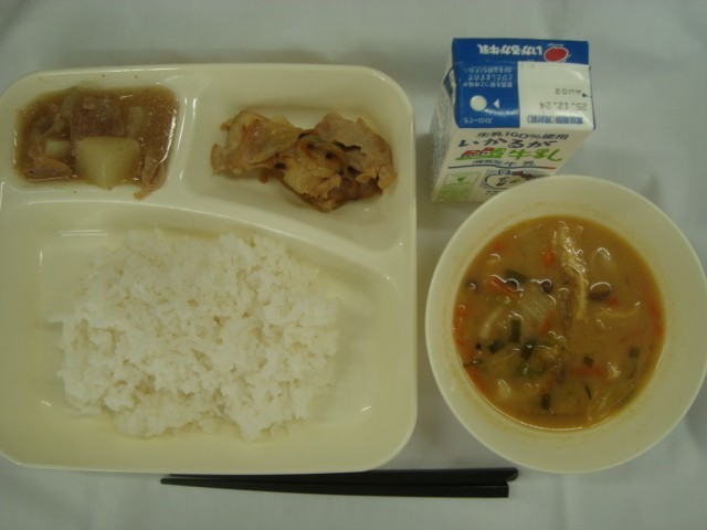 「鶏肉の甘辛焼き みそ汁 だいこんの煮もの ごはん 牛乳」