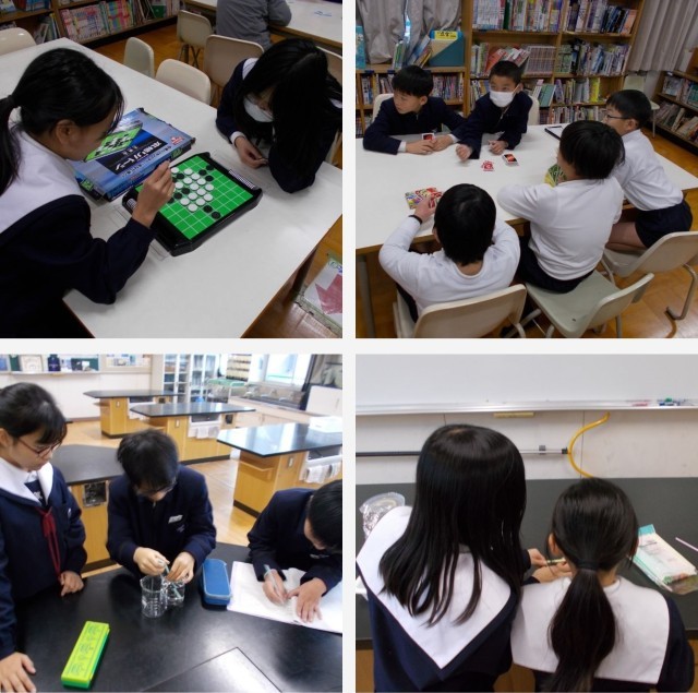 2学期最後のクラブ活動がありました。「室内ゲームクラブ」では、クイズやテーブルゲームなどの活動を友だちや先生と一緒に楽しみました。「科学クラブ」では、どうすればストローを使ってビーカーの水を移動させることができるのか、実験をしながら考えました。次回のクラブ活動は、3学期・1月22日(木)の予定です。