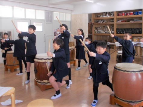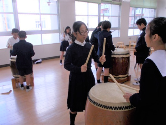 5年生の子どもたちが、総合的な学習の時間に「和太鼓」に取り組んでいます。「力強く」「楽しく」「美しく」の3つのテーマから1つ選び、演奏の練習に励んでいます。3学期に予定している発表の機会が楽しみです。