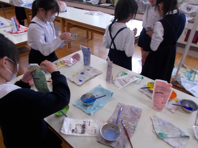 4年生の図画工作科「どろどろかっちん」の授業の様子です。前の授業で使用した液体粘土が乾き、着色している様子です。それぞれの世界観をもとに、自分たちで話し合いながら着色を進めています。冬休みの間は、学校でしっかりと乾かして、3学期に仕あげていきます。完成が楽しみです!