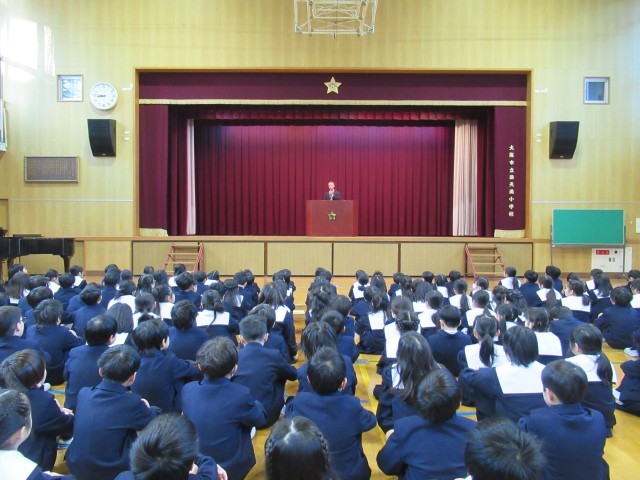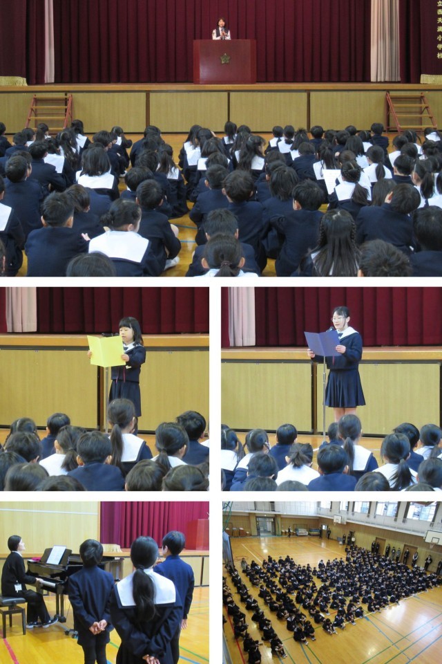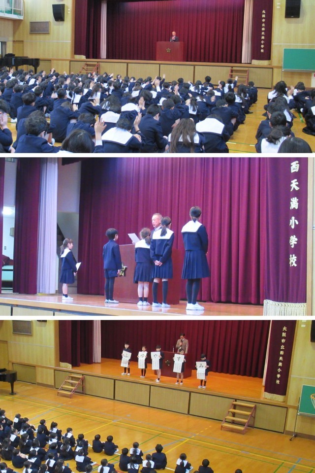 2学期の終業式を行いました。校長先生からは、心の通知表についてのお話がありました。「困っている人に優しくできた」「仲のいい友だちだけでなくいろいろな人と過ごすことができた」など、校長先生からの問いかけに対して、2学期の自分自身をふり返りました。また、読書感想文の表彰があり、頑張りを拍手でたたえました。続いて、生活指導の先生からは、「ふ・ゆ・や・す・み」の言葉に合わせて生活の中で気を付けることを、天満警察署の方からは、事故にあわないように交通安全に気を付けることについてお話がありました。そして、2年生と6年生の児童が2学期の振り返りの作文を読み、なわとびや自転車大会で頑張ったことを発表しました。最後に、全員で校歌を歌い、温かい歌声が講堂に響きました。