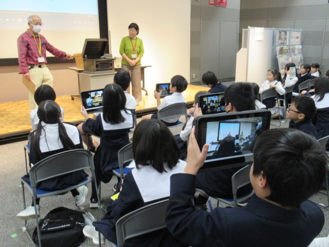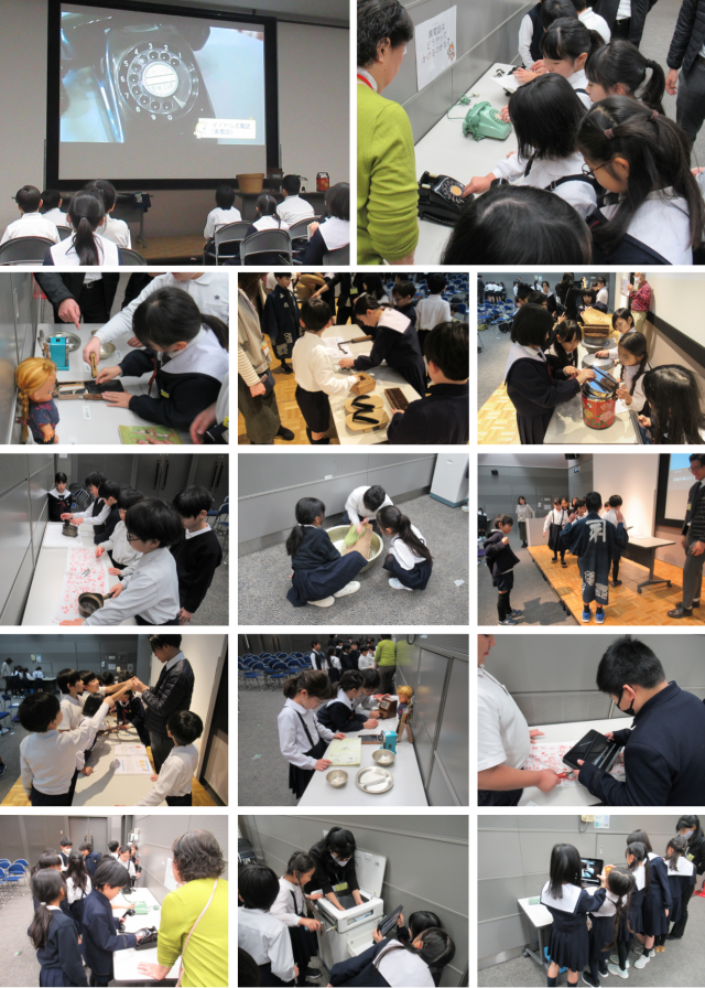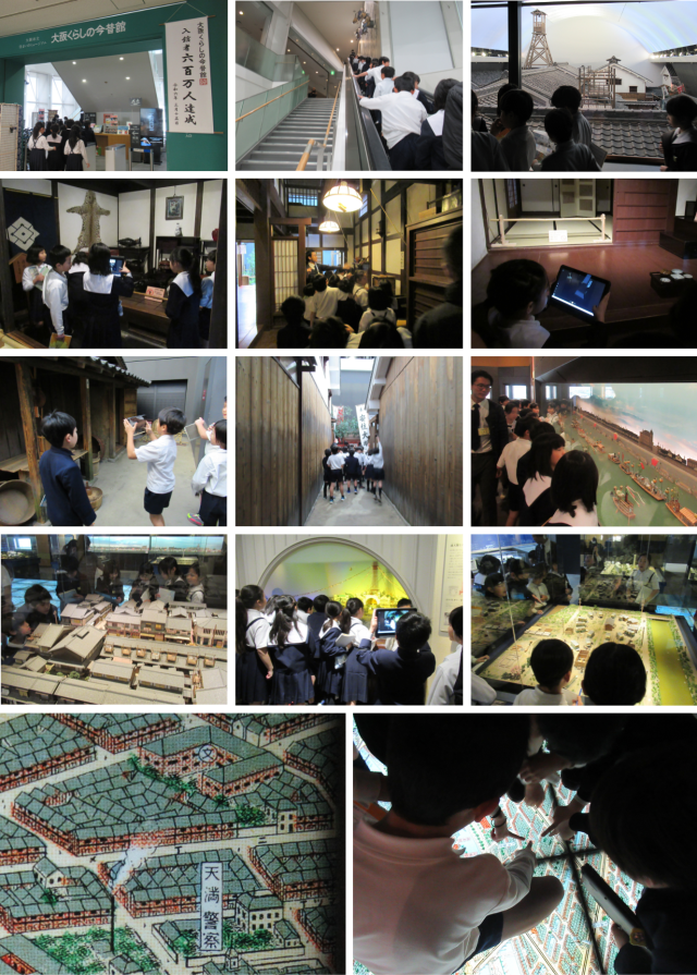 3年生の子どもたちが、社会見学で「大阪くらしの今昔館」に行ってきました。昔の道具を体験するフロアでは、黒電話やアイロン、洗濯機や炊飯器など、現代とは全く違う道具を楽しく使うことができました。また、江戸時代の大阪の町家が再現されているフロアでは、まるでその時代にタイムスリップしたかのような体験ができました。さらに、百年以上前の昔の地図が床一面に広がっているフロアでは、「西天満小学校」を見つけて、本校の長い歴史に思いをはせることができました。グループごとに学習者用端末で記録を残すこともでき、とても有意義な社会見学となりました。