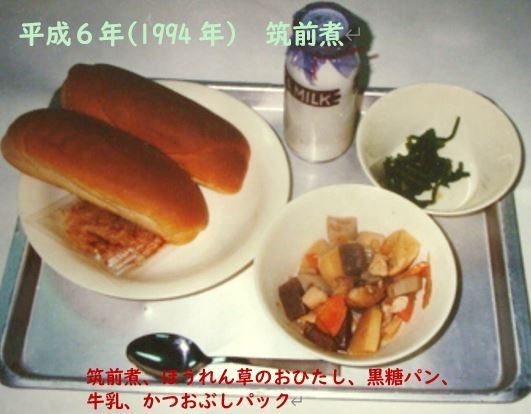 筑前煮は、昔から登場している献立です。平成6年当時はパン献立でした。写真はともに、3・4年生仕様の量です。