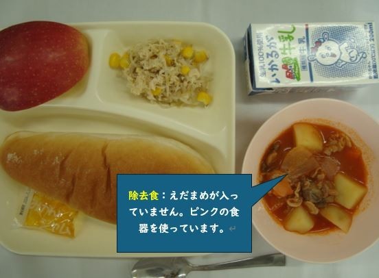 給食では、食物アレルギーで食べることができない児童に、その食材を除いたおかずを提供する献立があります。除去食は、ピンクの食器で提供されます。今回は、大豆(えだまめ)の除去食がありました。