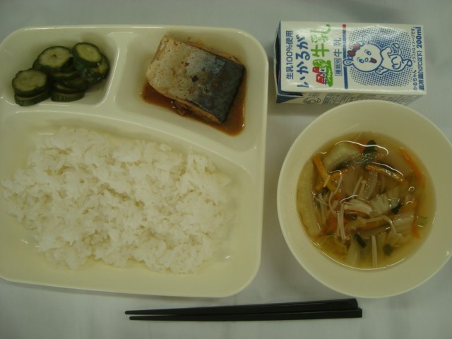 「さばのみそ煮 五目汁 きゅうりの甘酢づけ ごはん 牛乳」