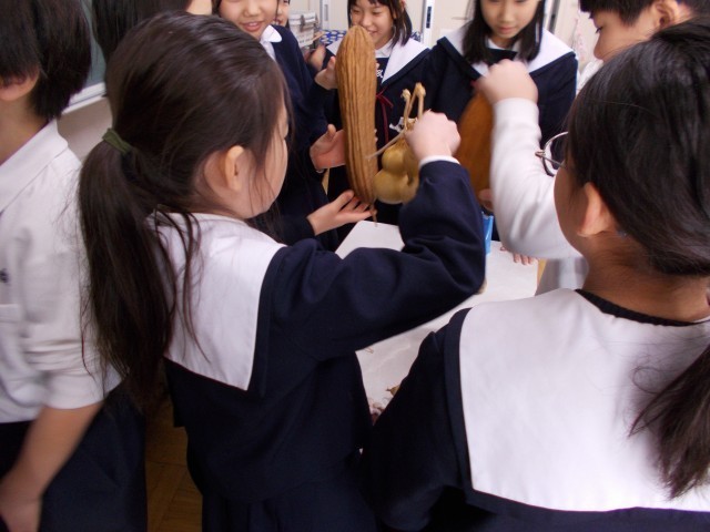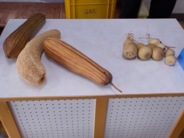 今回の4年生の理科では、収穫したヘチマとヒョウタンの観察をしました。「ヘチマは振るとカラカラと音がする」「楽器みたい」という発言の後、専科の先生にヘチマの底から種を外へ出してもらいました。すると、「ヒョウタンは音がしない」「どうやって種が外に落ちるんだろう」という疑問が生まれ、乾燥した後割れて種が外に出ることや人が上の部分を切って外に出すことなどを知ることができました。とても興味深い学習となりました。
