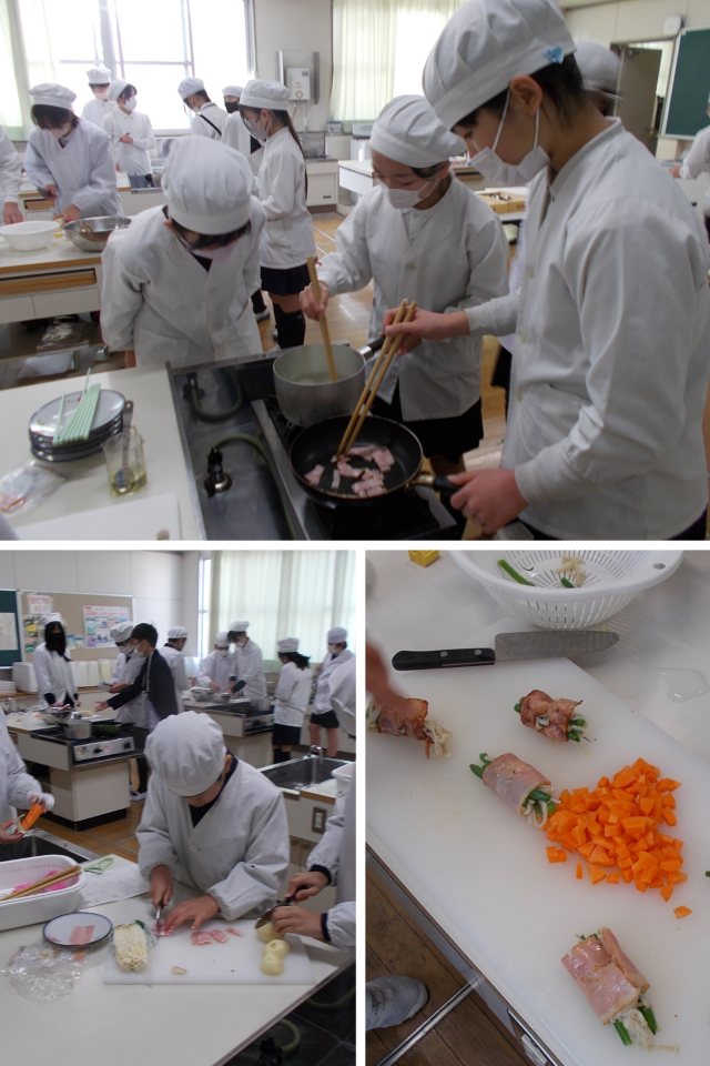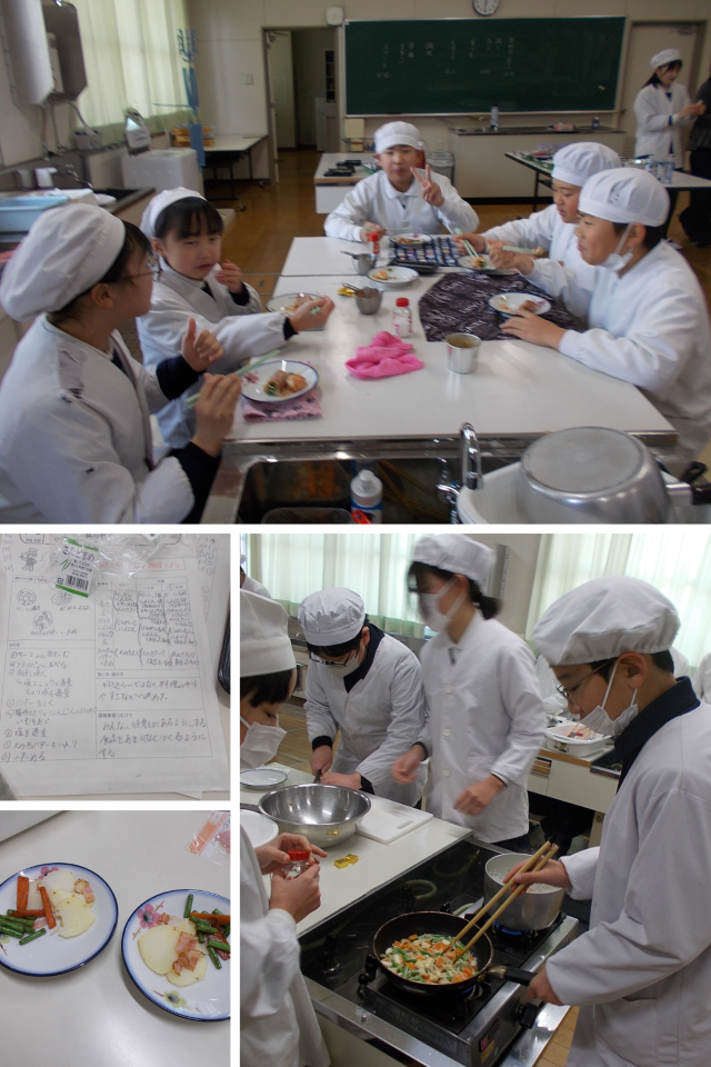 6年生が家庭科の学習で調理実習を行いました。用意された材料から「何が作れるか」を自分たちで考え、話し合いながら献立を決定しました。計画した作業の手順や役割分担を意識しながら、どの班も協力しておいしく仕上げることができました。