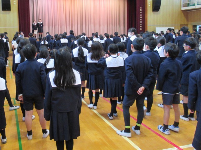 今日の児童集会では、「声あてゲーム」をしました。舞台のカーテンの後ろに隠れた先生の声だけを聞いて、どの先生かをあてるゲームです。人気のキャラクターの自己紹介や好きな食べ物などいろいろなセリフを聞き、班でどの先生かを予想しました。カーテンから先生が登場すると「やっぱり~」や「え~!」など楽しげな声があがっていました。