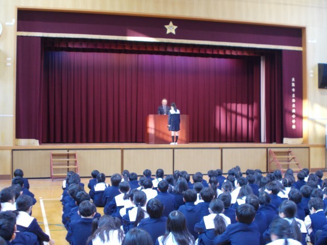 全校朝会がありました。今回は、校長先生から寒い冬でも心が温かくなる「ポカポカことば」についてのお話がありました。「ありがとう」「どういたしまして」などの言葉を、相手の気持ちを考えてつかえるようになるといいですねというお話を、子どもたちが集中して聞いていました。また、「伝えよう!いのちのつながり」作文の表彰があり、頑張りを拍手でたたえました。最後に、給食委員会から給食週間についてのお知らせがありました。全校児童からの給食調理員さんへのお礼の手紙を代表者が渡し、調理員さんから給食を作るときに気を付けていることについてのお話を聞きました。今週は、給食時間に給食にまつわるクイズもあるということです。いつも以上に給食への感謝の気持ちを大切にして食べたいですね。