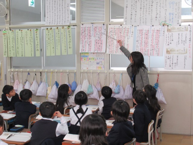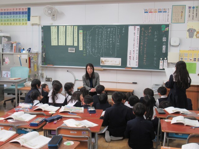 本校では「協働的な学びを通して互いに高めあう子どもを育てる」をテーマに授業研究会を実施しています。今回の授業は、2年生の国語「お手紙」の学習でした。「なぜ二人ともしあわせな気持ちになったのか考えよう」というめあてをクラス全員で立てました。そのめあてに向け、がまくんはかえるくんのお手紙のどこを「とてもいい」と言っているか考えたり、自分と登場人物を比べて思ったことや考えたことを書いたりする学習を行いました。授業が終わってからも「まだやりたい!」などの声が多く、とても意欲的に学ぶことができていました。お散歩交流なども通し、協働学習を進めることができました。