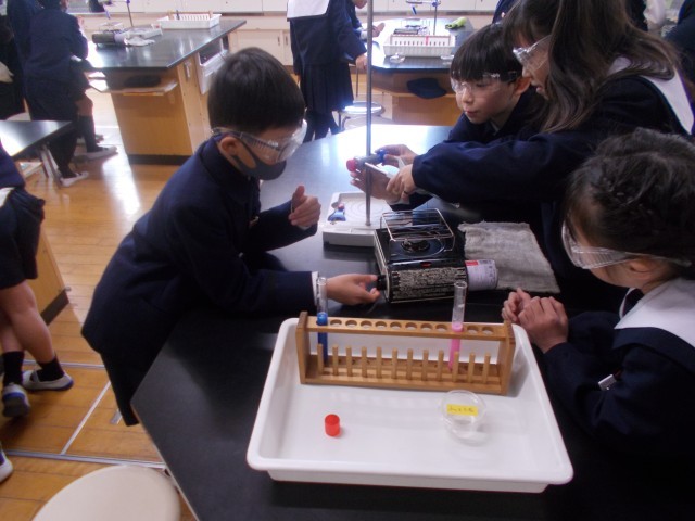 4年生の理科の時間に、水のあたたまり方について実験をしました。青からピンクに色が変わっていくのを見て「上のほうをあたためても下のほうは色が変わらないな」「下のほうをあたためても上の色が変わっている」とたくさん考えることができました。次の実験が楽しみです。