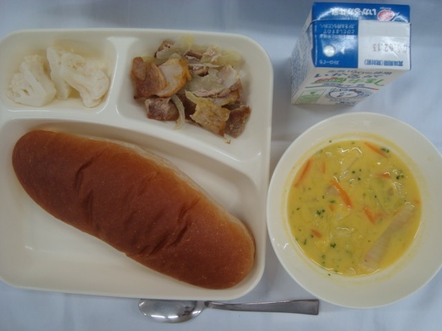 「豚肉のカレー風味焼き コーンスプ カリフラワーのピクルス 黒糖パン 牛乳」