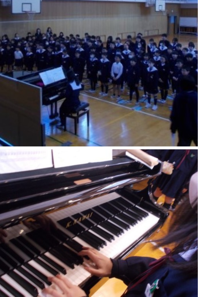 初めに、いよいよ今月末に迫ったお別れ集会で歌う曲「ずっとずっと」を練習しました。3・4・5年生は副次的な旋律を担当し、2つのパートに分かれて合唱することにも挑戦します。3年生は、しっかりとした芯のある声で歌っていました。4・5年生はその歌声を包むようにふんわり優しい声で歌い、講堂いっぱいに澄んだ歌声が響きわたりました。伴奏は5年生の児童が担当します。全校で一緒に歌うのが本当に楽しみです。