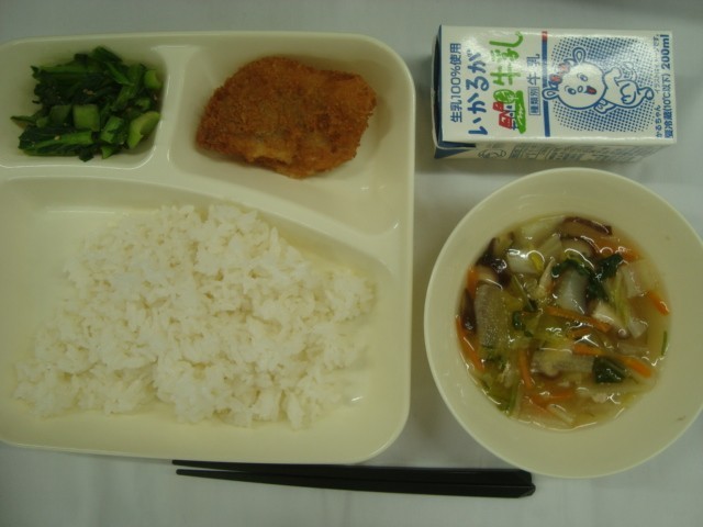 「たらフライ うすくず汁 こまつなのごまあえ ごはん 牛乳」
