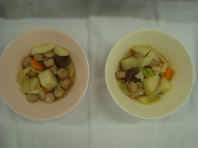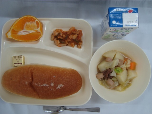 「ポトフ(除去食:大豆) 鶏肉と野菜のケチャップソテー デコポン パン バター 牛乳」