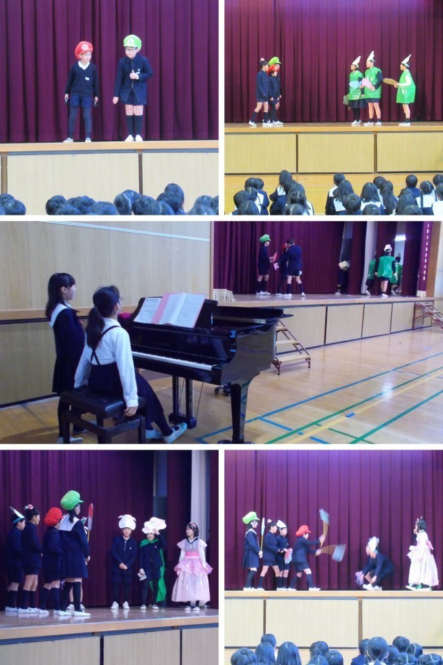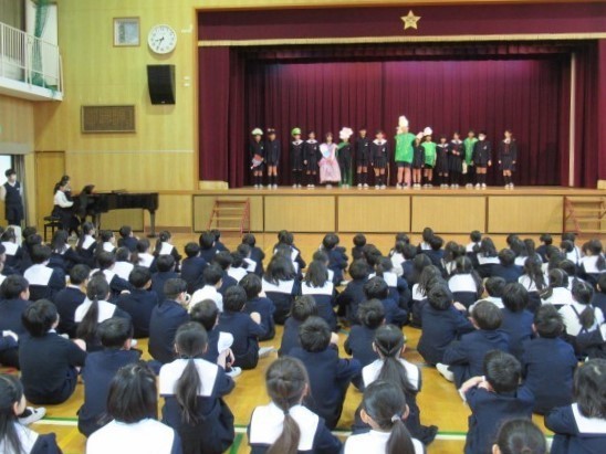 今回の児童集会では、健康委員会の子どもたちが「早寝・早起き・朝ごはん」の大切さを伝える楽しい劇を披露してくれました。生活リズムを整えて元気な毎日を守るキャラクターが登場し、ユーモアを交えながら、規則正しい生活の大切さをわかりやすく伝えてくれました。見ている子どもたちも思わず引き込まれ、楽しみながら健康について学ぶことができました。これからも毎日の生活リズムを大切にして、元気いっぱい過ごしていきましょう!