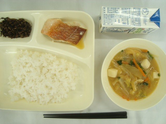 「あかうおのレモンじょうゆかけ みそ汁 牛ひじきそぼろ ごはん 牛乳」