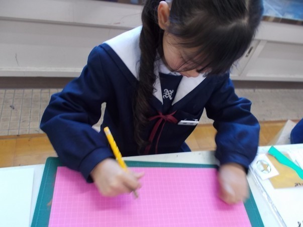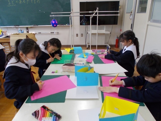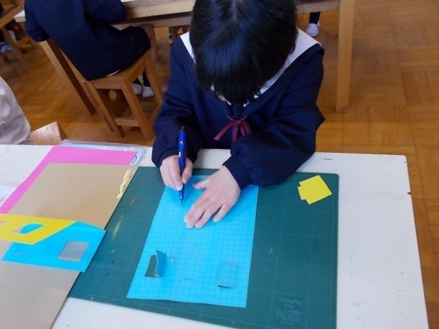 2年生の図画工作では、カッターナイフの使い方を学習しています。正しい持ち方で、ゆっくりゆっくり丁寧にカッターナイフを動かしています。きれいに切れたときは思わず「やったあ!」と声があがることも。カッターナイフを使った作品「まどのあるたてもの」は、教室に展示しています。学習参観後に、ぜひ教室まで見に来てください。