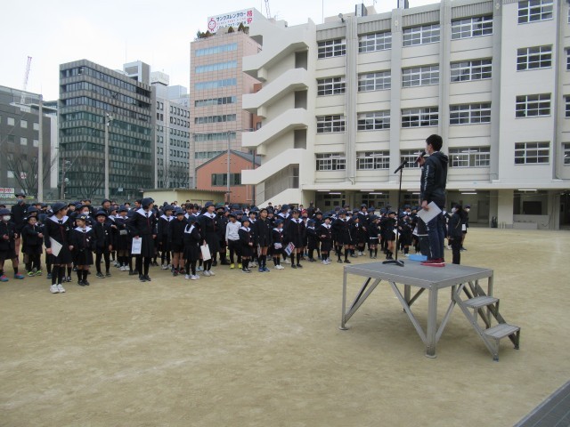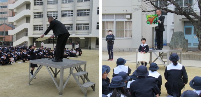今朝の集会では、2つの表彰がありました。1つ目は、先日行った「たてわり大縄集会」です。金賞を受賞した3つの班の班長が、校長先生から表彰状を受け取りました。2つ目は、「大阪市読書感想画コンクール」です。優良賞を受賞した児童が、表彰状と副賞を校長先生から受け取りました。受賞した作品も紹介され、頑張りを拍手でたたえました。