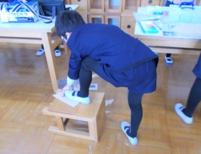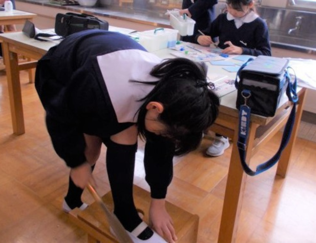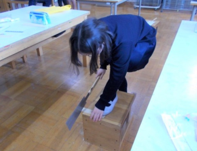 4年生の子どもたちが、1年ぶりに図画工作の時間にのこぎりに挑戦しました。のこぎりを手にするのは久しぶりですが、3年生の時のことを思い出し、手際よくあっという間に板を切ることができました。切りとった形を組み立てて、何ができあがるか楽しみです。