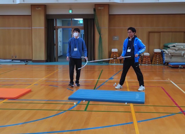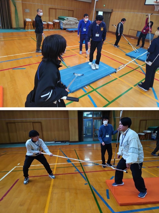 本校の教職員が、不審者対応訓練の一環として、刺股の使い方についての研修を行いました。不審者を取り押さえるのではなく、警察到着までの時間を確保するために設置されている刺股を実際に使用し、どのようにして対処すればよいかを体験しながら確かめました。