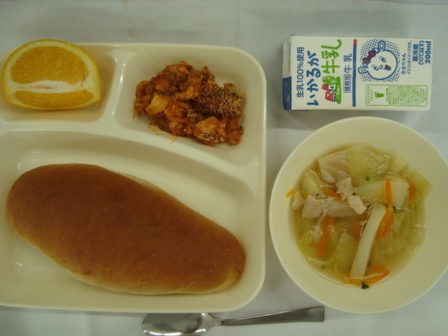 「とうふのミートグラタン じゃがいもと野菜のスープ はっさく 黒糖パン 牛乳」