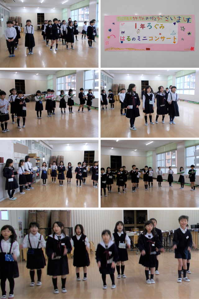 1年間の音楽の学習のまとめとして、1年生が「春のミニコンサート」を開きました。何の曲を歌おうか、合奏する曲はどれにしよう、先生に伝えたい言葉は…と、プログラムは子どもたちが考えました。大切なお客さまとして、担任の先生をお迎えしました。