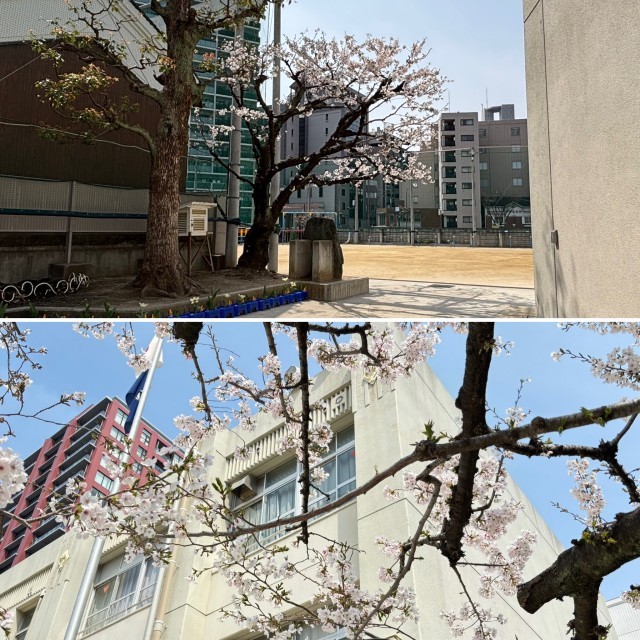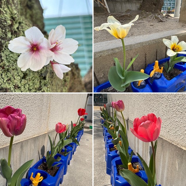 春休み中の学校では、桜の花がきれいに咲き、春らしい景色が広がっています。1年生が植えたチューリップも、色とりどりの花を咲かせていて、とてもきれいです。子どもたちのいない学校は少し静かですが、花々が学校を明るくしてくれています。新学期、登校してきた子どもたちがこの春の景色を見るのが楽しみです。