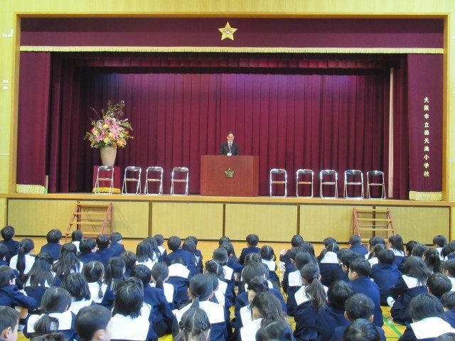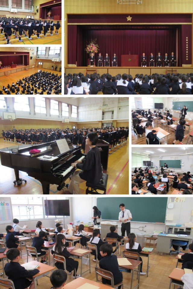 令和8年度の着任式・始業式を行いました。着任式では、新しく来られた教職員のみなさんのお話を聞き、子どもたちは「おはようございます」「よろしくお願いします」と元気な声で挨拶をしていました。続く始業式では、校長先生から新しい学年の担任や担当の先生が発表され、子どもたちは新たな出会いに目を輝かせていました。最後に、2~6年生で校歌を歌い、明るく伸びやかな歌声が講堂いっぱいに広がりました。新しい学年のスタートにふさわしい、気持ちのよい一日となりました。