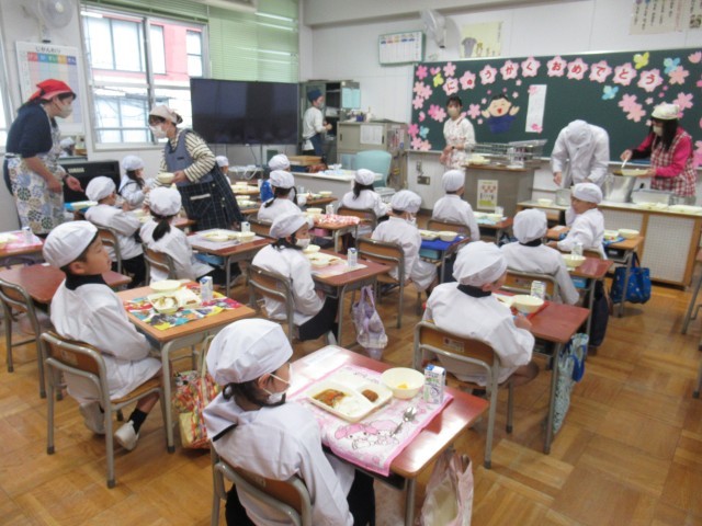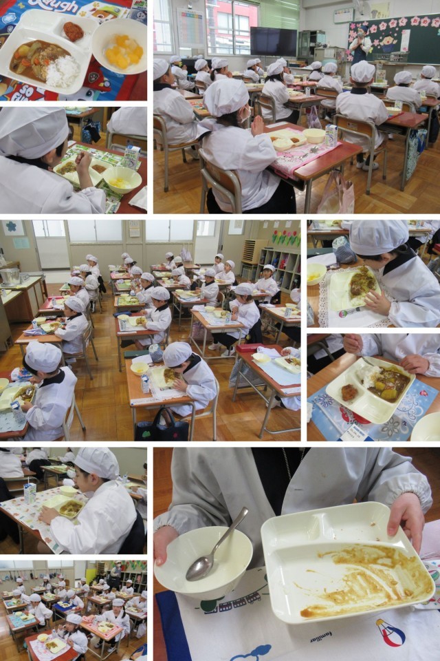 入学した1年生も、元気に給食の時間を迎えました。今日の献立は「入学お祝い献立」で、カツカレーライスやフルーツゼリーが登場しました。子どもたちは「おいしい!」と笑顔いっぱいで、楽しそうに食べていました。入学してすぐの給食とは思えないほど、しっかりと食べる姿が印象的でした。また、食べ終わった後の食器もとてもきれいで、「ごちそうさま」の気持ちがしっかりと表れていました。これからも、楽しく、おいしく給食の時間を過ごしてほしいです。