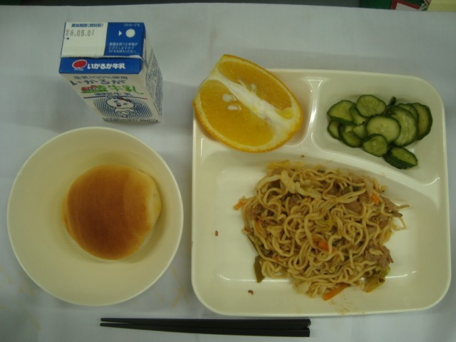 「焼きそば きゅうりのしょうがづけ あまなつかん ミニコッぺパン 牛乳」