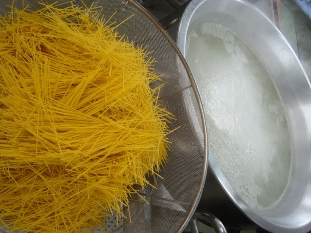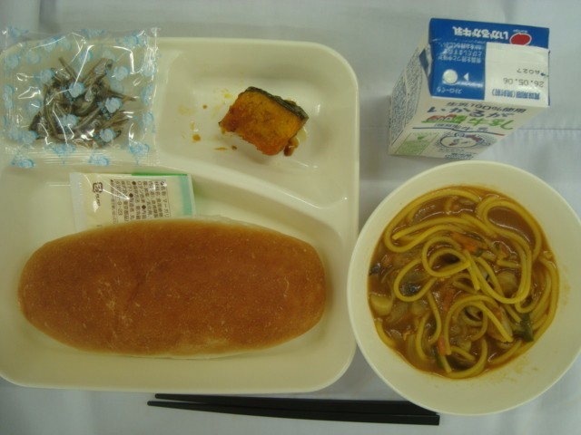 「カレースープスパゲッティ かぼちゃのマリネ焼き パン ミニフィッシュ マーガリン」