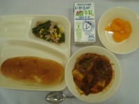 4月14日「ビーフシチュー ベーコンとさんどまめのソテー みかん缶 おさつパン ...