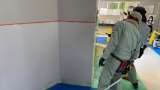 学園営繕園芸事務所により、廊下の壁の補修をしています。綺麗にペンキを塗ってもらい...