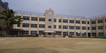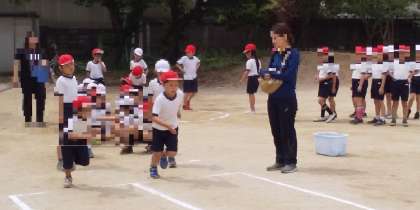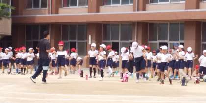 菅北小学校は運動場で50mがとれませんので、今日は全校児童が豊崎東小学校に来て、50mを測りました。豊崎東小学校の運動場を2時間お借りして無事学校に着きました。