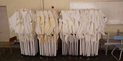 昨年度まで、運動会のテントは本部席や来賓席、敬老席にしかありませんでしたが、児童の熱中症予防のため、本年度は児童席にテントを張ることにしました。天満中学からテント8張お借りし、PTAの予算から運搬料を出して運んでいただきました。ごめんなさい、保護者席にはテントはありません。