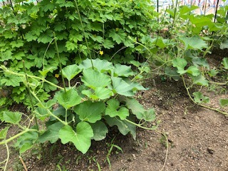 葉がどんどん大きく育っています!夏の終わりにはひょうたんやカボチャを収穫できそうです。写真上がひょうたん 下はカボチャです。4年生・5年生が観察しています!