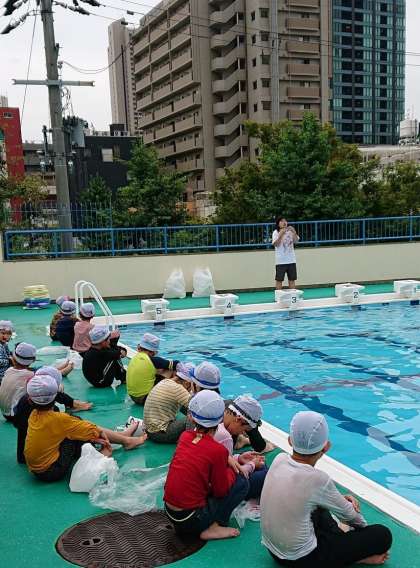 7月18日(木)、夏休みを前に、2・4・6年生で着衣泳を実施しました。シャツやズボンなどを身に着けて水に入るとどうなるか、「もしも」のときに慌てずに対処する方法を学ぶためです。