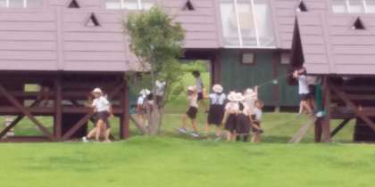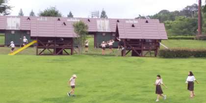 お弁当を食べたあと、ドーム近くの芝生広場でアスレチックをして遊んでいます。雨は降っていません。