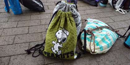 このあと、魚つかみをして焼き板を磨きます。リュックサックは全員家庭科で自分で作ったものです。最終日まで壊れないことを祈ります。
